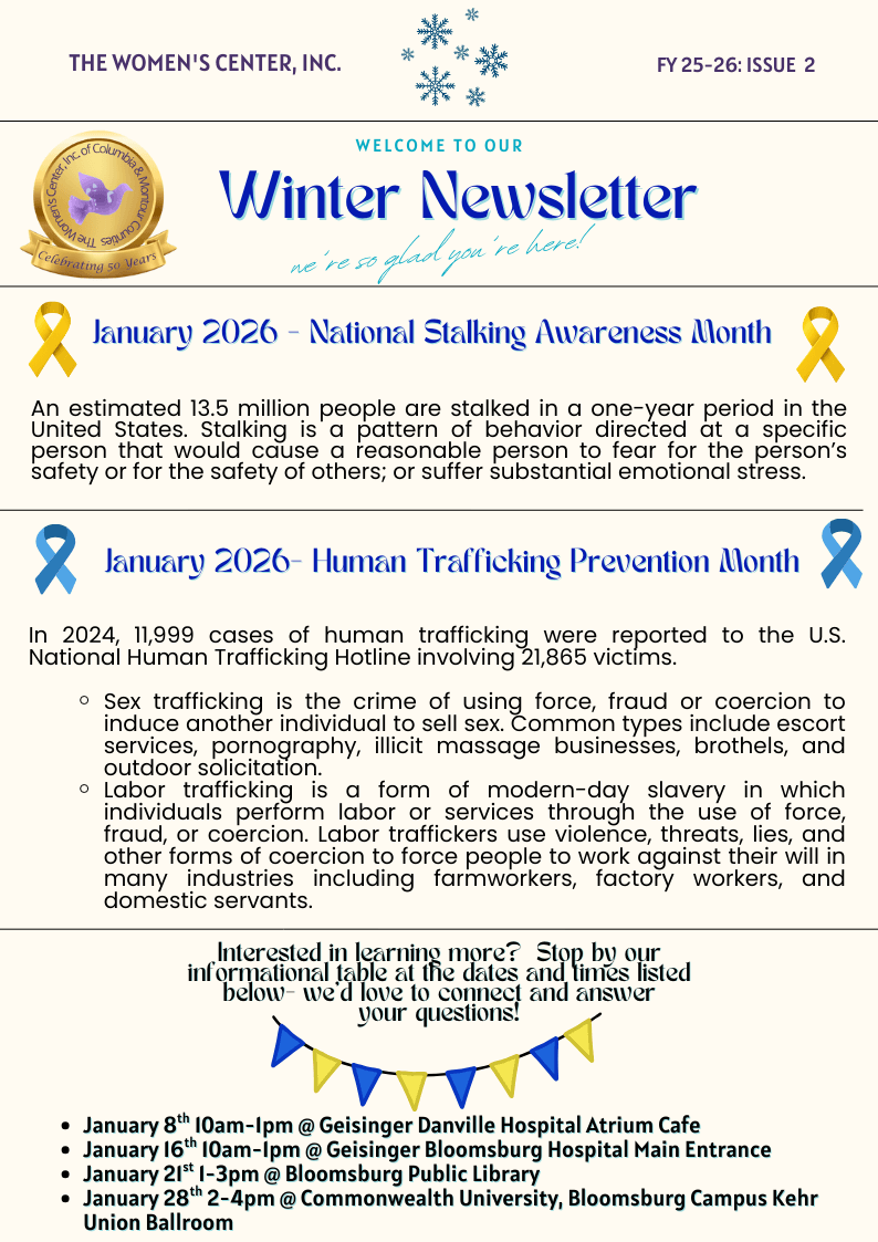 Throughout January, The Women’s Center, Inc. will host a series of informational tabling events in recognition of National Stalking Awareness Month and Human Trafficking Prevention Month. Community members are invited to stop by to learn more, ask questions, and connect with resources at locations including Geisinger Danville Hospital, Geisinger Bloomsburg Hospital, the Bloomsburg Public Library, and Commonwealth University Bloomsburg on select dates throughout the month. Click here to view the schedule.