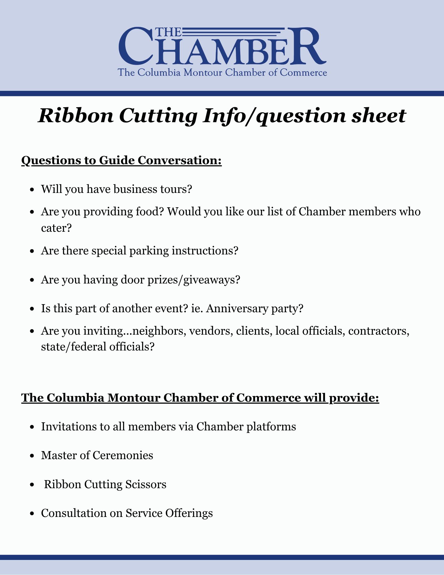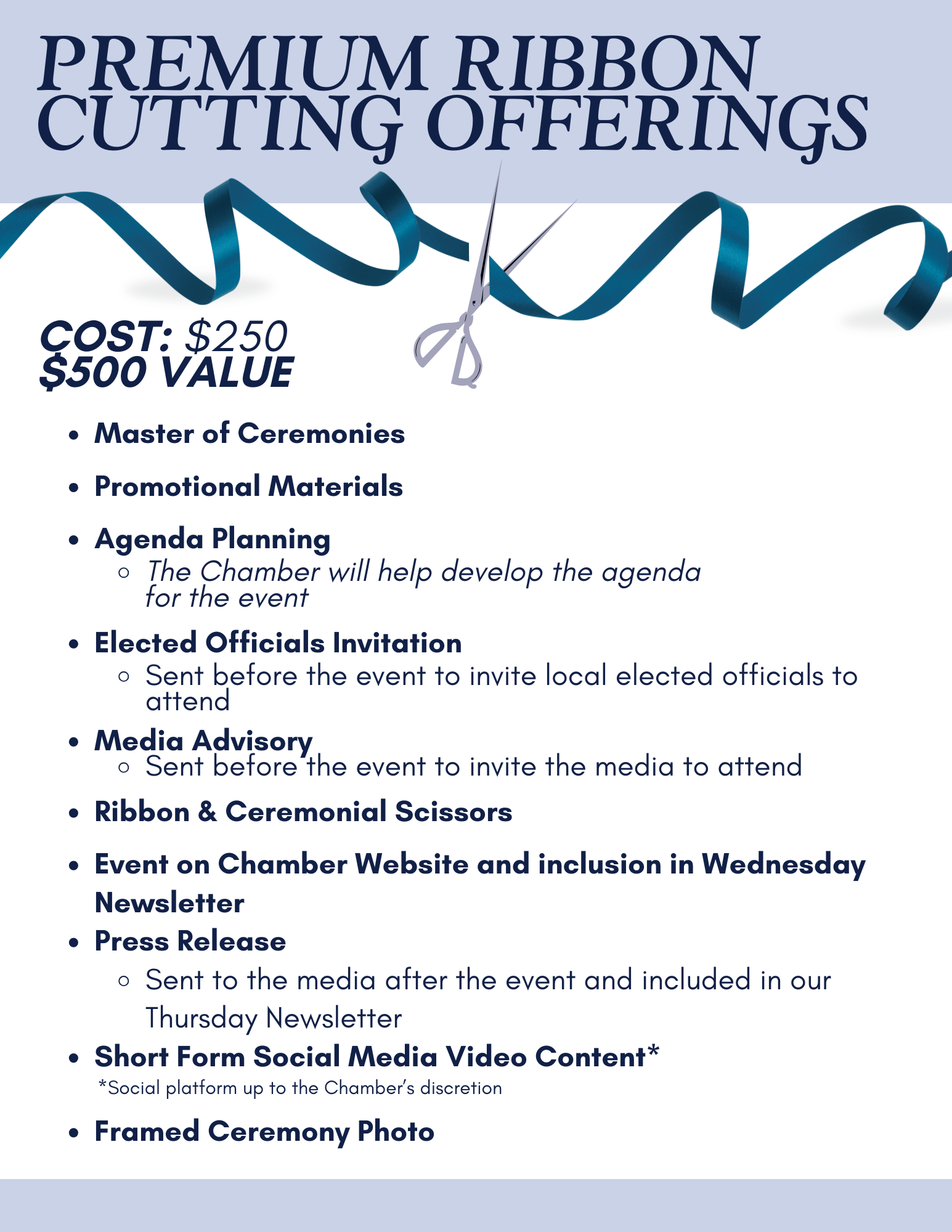 During the call, we will finalize your event details, select your ribbon cutting package, confirm the date and time, and discuss any specific needs for your celebration. Members may choose between the Classic Ribbon Cutting, included with membership, or the Premium option, which offers enhanced media and promotional features. While the Chamber strives to accommodate preferred dates and times, scheduling depends on staff availability and prior commitments. To ensure a well-coordinated, high-quality event, we ask for at least four weeks’ notice before your requested date.